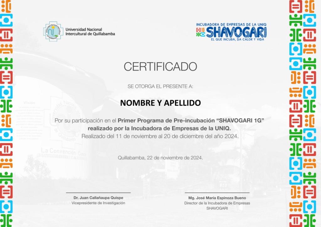 El programa de preincubación «SHAVOGARI 1G» tiene como propósito promover y visibilizar las líneas de emprendimiento y su impacto en la sociedad de la Incubadora de Empresas de la UNIQ. Este programa permitirá desarrolar habilidades en los equipos emprendedores en la formulación y validación de ideas de negocio innovadoras y creativas. El programa se llevará a cabo desde el mes de noviembre hasta diciembre del 2024.